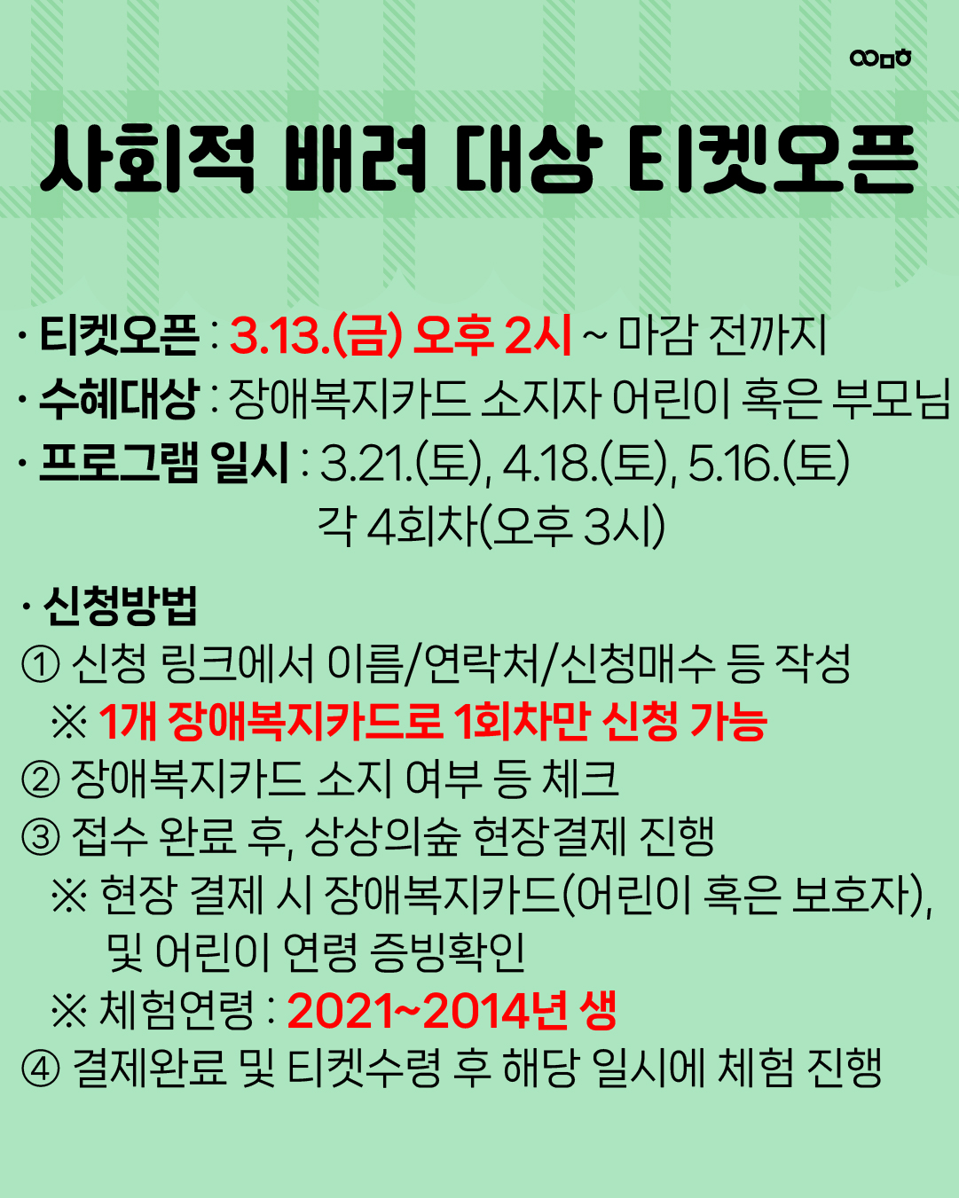 사회적 배려 대상 티켓오픈은 선착순 마감되었습니다. 감사합니다 :)